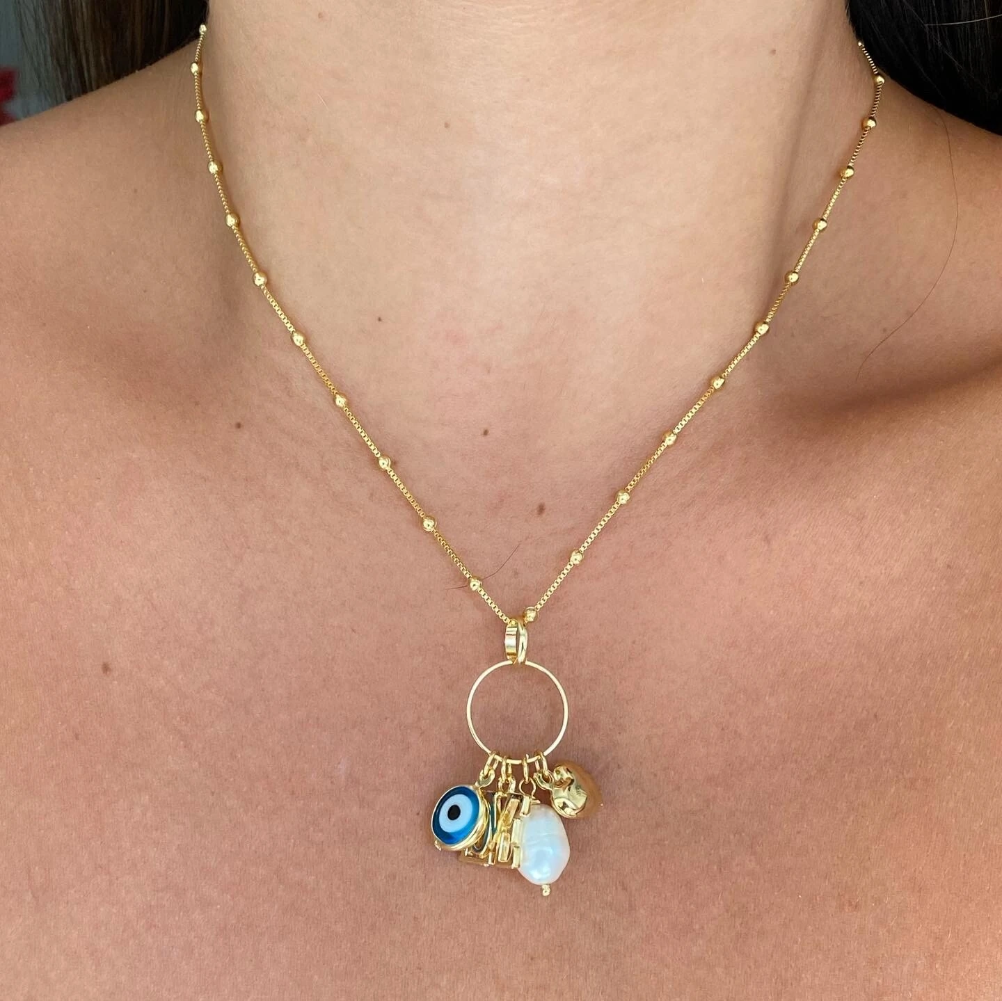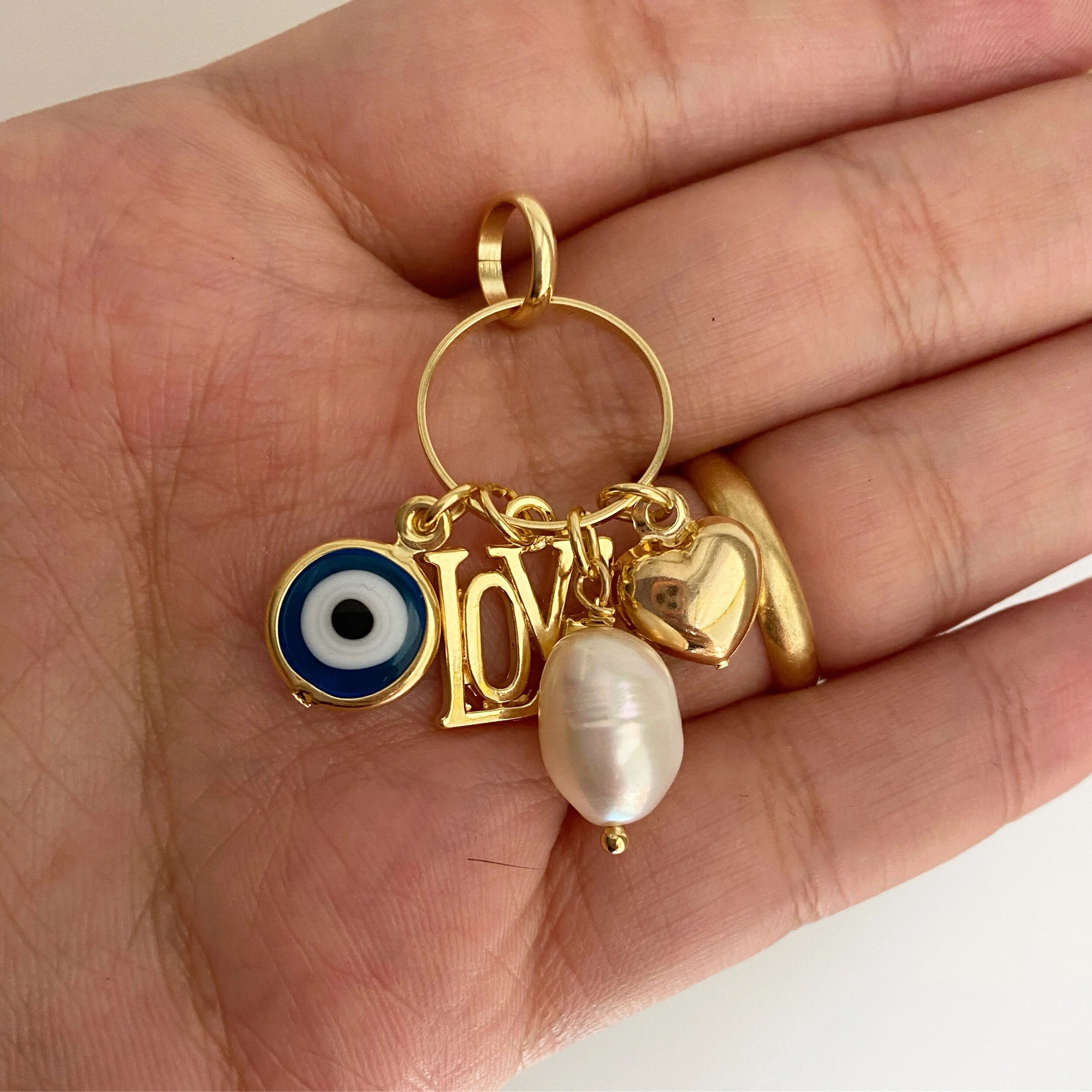Pingente em metal hipoalergênico com banho de ouro 18k e pingentes: Pérola natural, coração, olho grego e love.