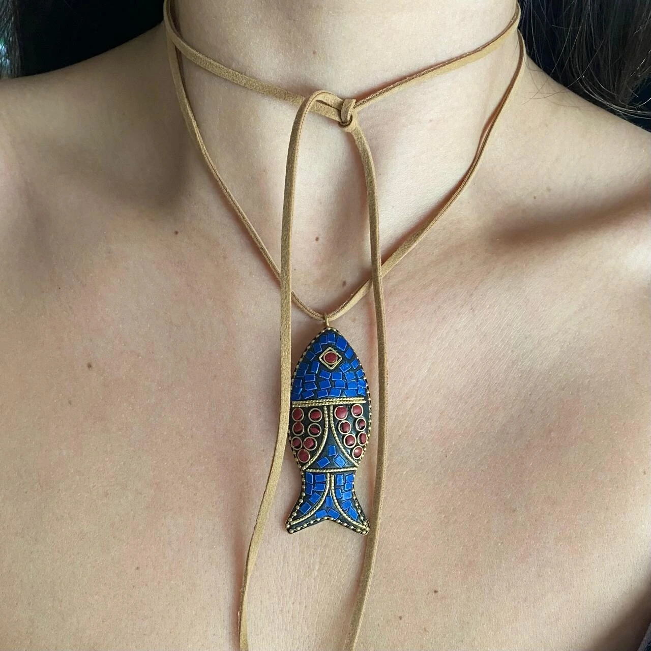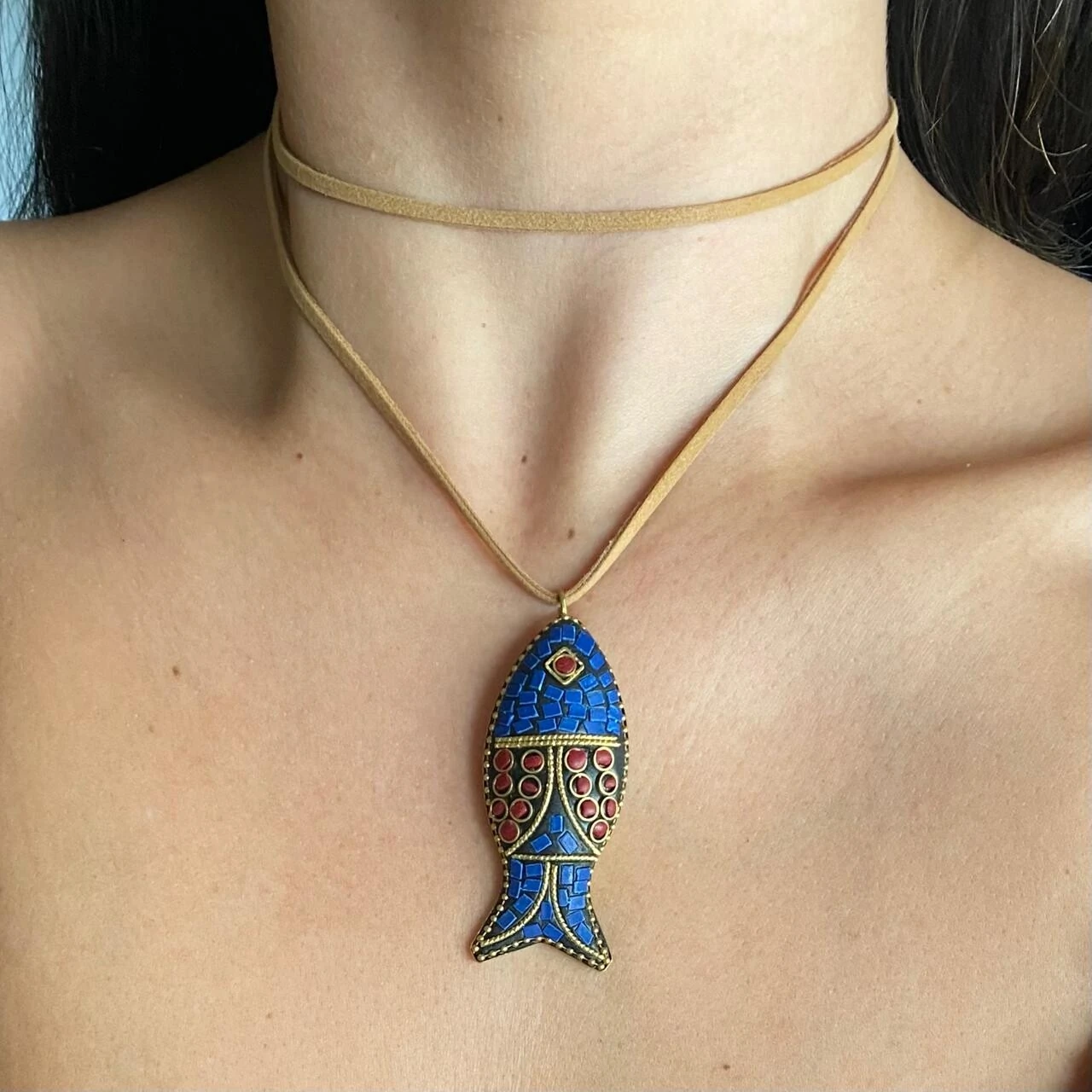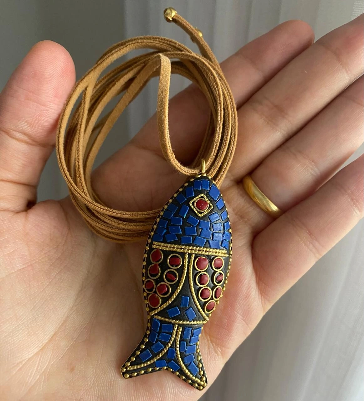 Colar em couro caramelo com acabamentos em metal hipoalergênico com banho de ouro 18k e pingente de peixe (o pingente sai do couro).