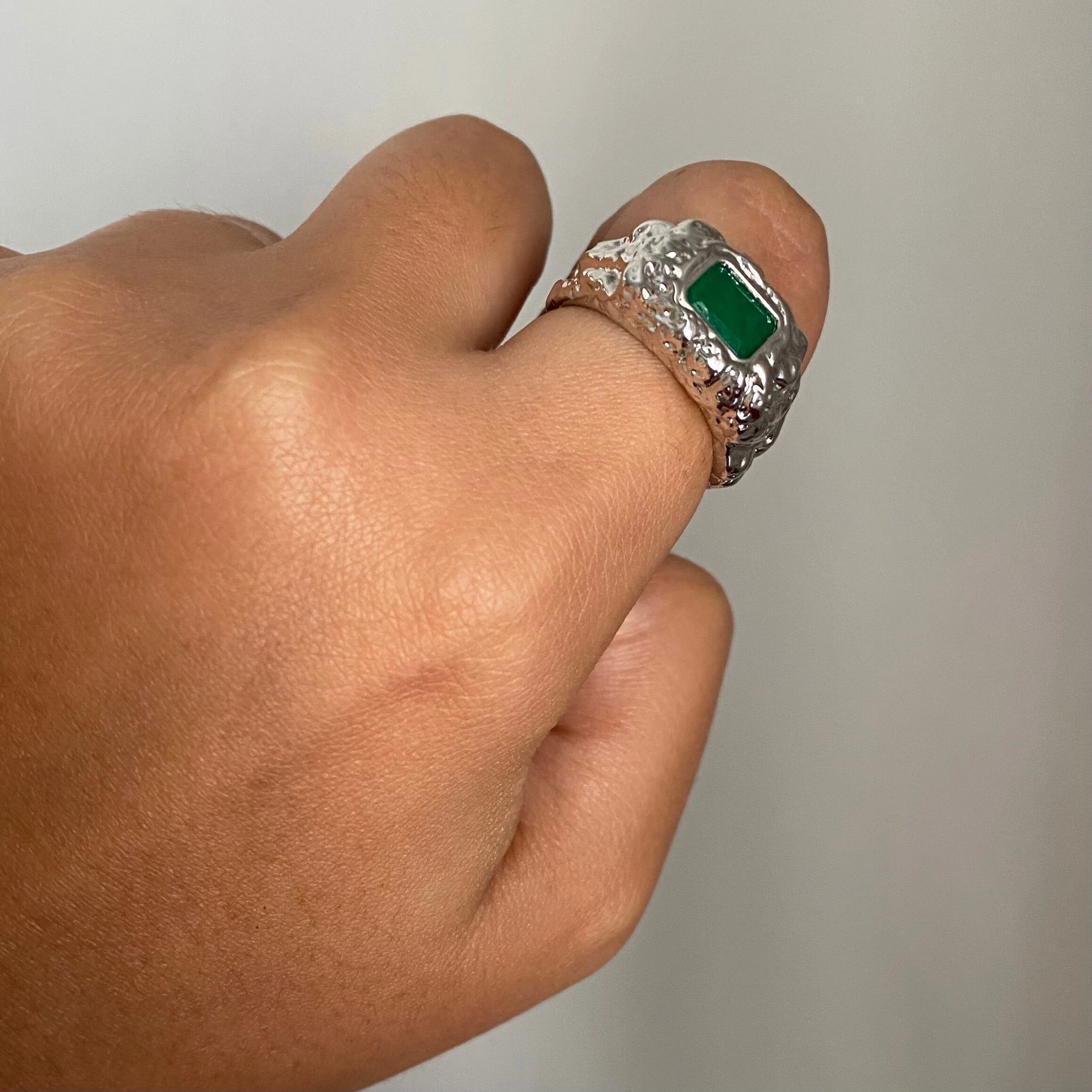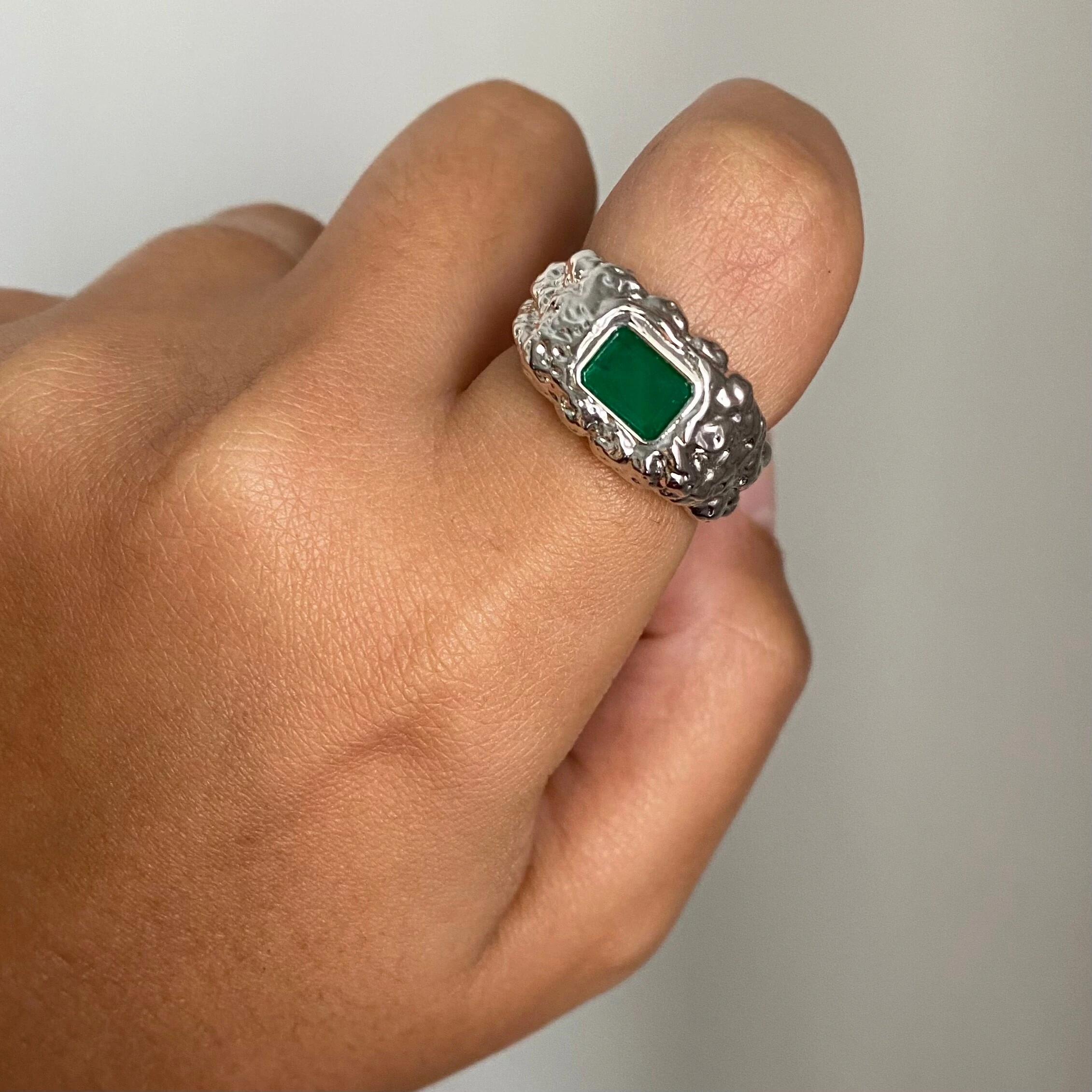 Anel em metal hipoalergênico com banho de ródio e zircônia verde.