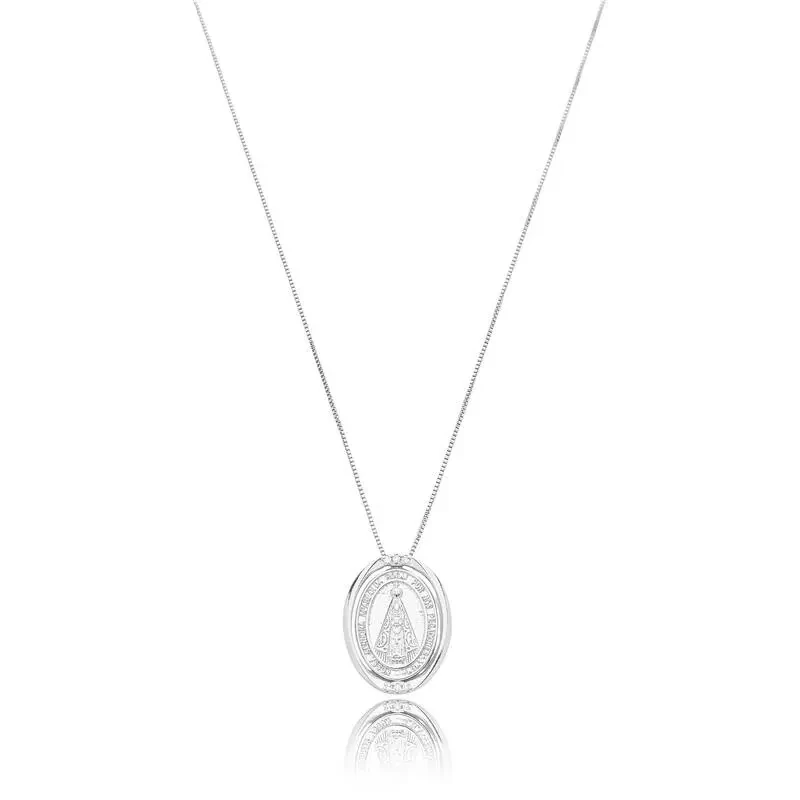 Colar em metal hipoalergênico com banho de ródio e Medalha de N. Sra das Aparecida / Terço com 3 zircônias em cima e embaixo.