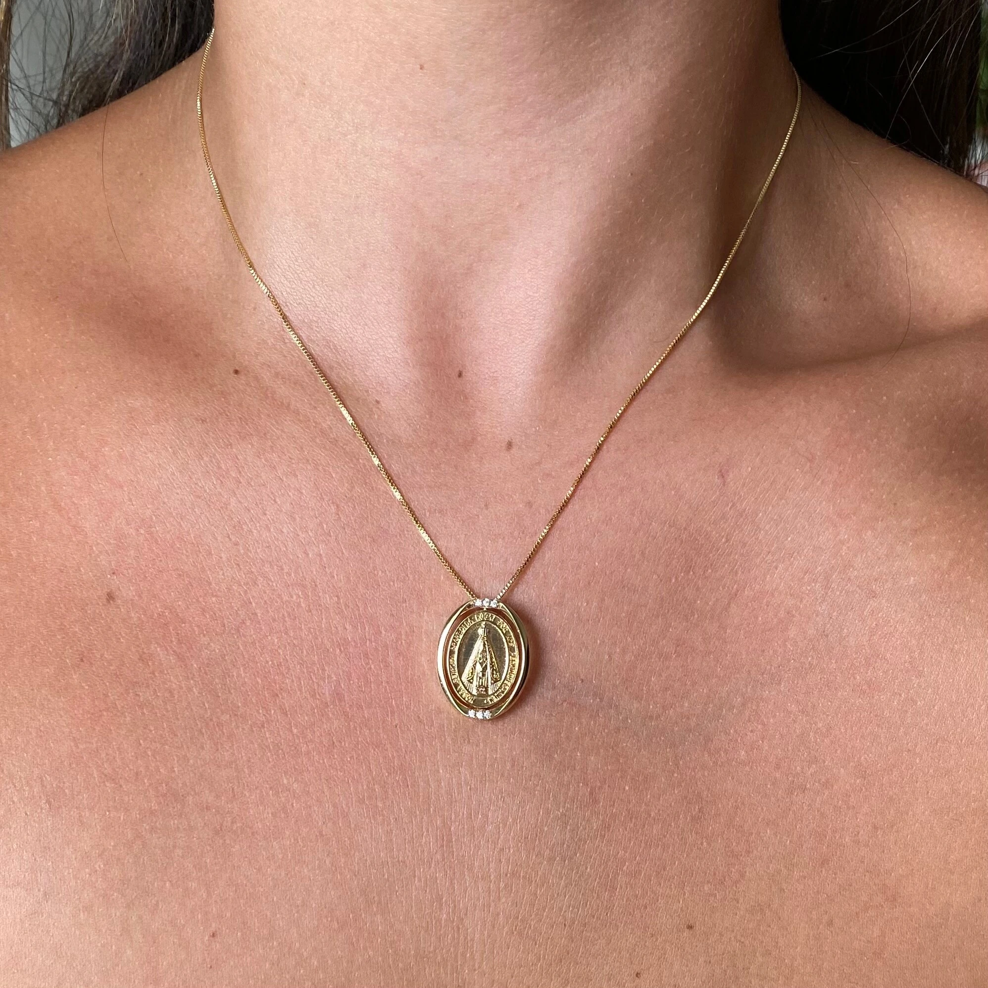 Colar em metal hipoalergênico com banho de ouro 18k e Medalha de N. Sra das Aparecida / Terço com 3 zircônias em cima e embaixo.
