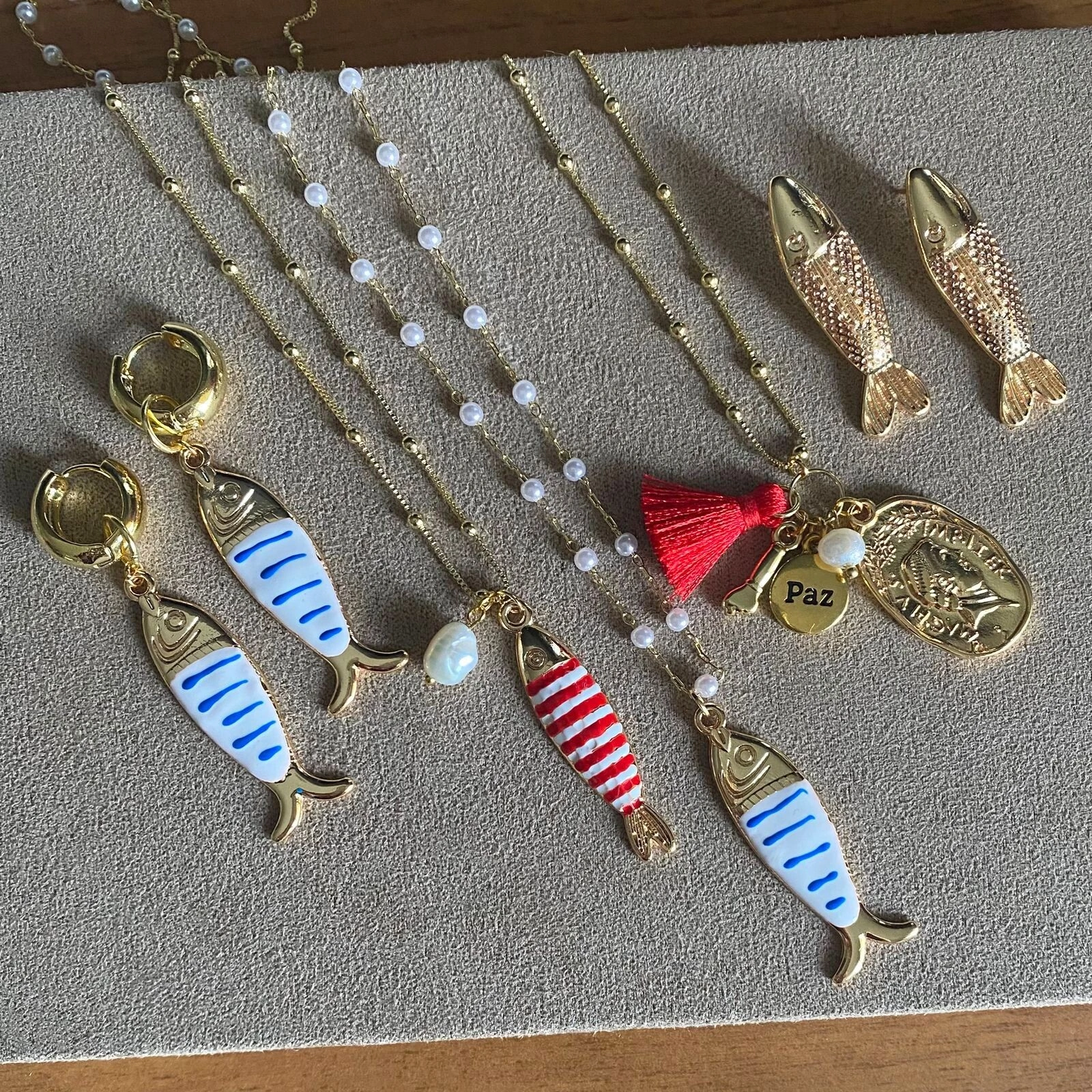 Colar em metal hipoalergênico com banho de ouro 18k e pingentes de peixe esmaltado e pérola natural.