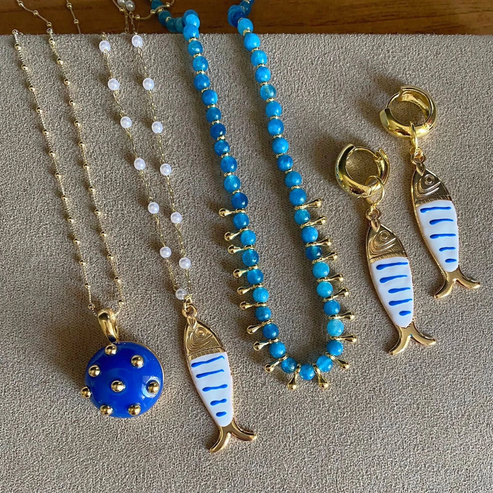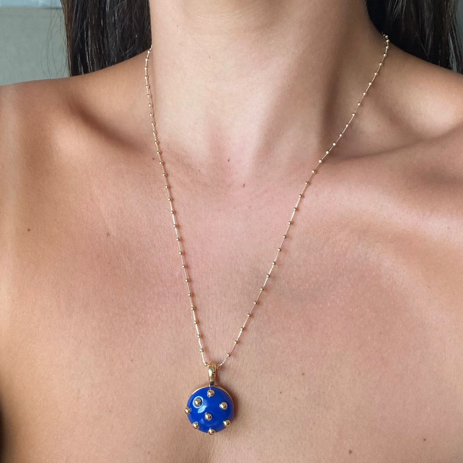 Colar em metal hipoalergênico com banho de ouro 18k e pingente de botão em acrílico removível.