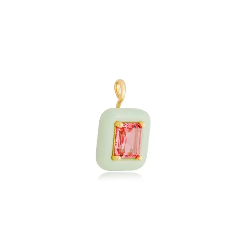 Colar em metal hipoalergênico com banho de ouro 18k e pingente removível de retângulo com cristal pink e resina verde água.